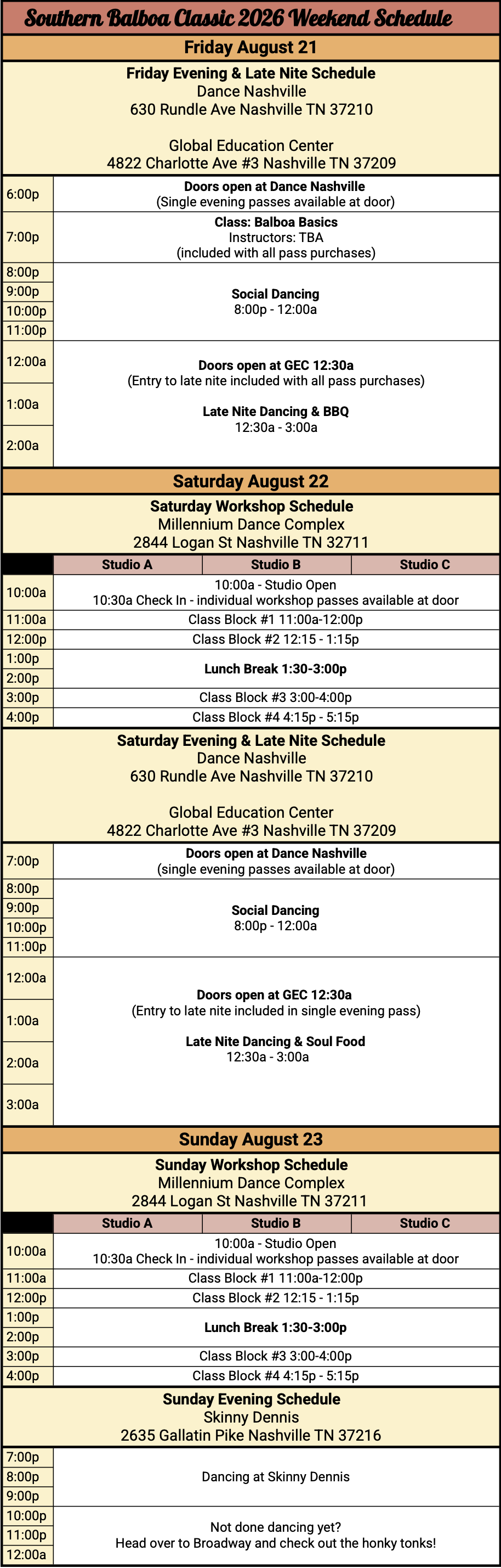 Southern Balboa Classic 2026 Weekend Schedule Times are subject to change Subscribe to our newsletter. Sign up with your email address to receive news and updates. Email Address Sign Up Thank you!